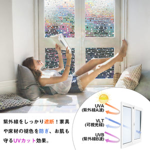 目隠し・UVカット効果:視線を遮り、自然な目隠し効果を発揮。UVA、UVBをカットし、室内の家具や床の劣化、肌への影響を軽減します。明るさを保ちながらプライバシーを守れる窓フィルムです。